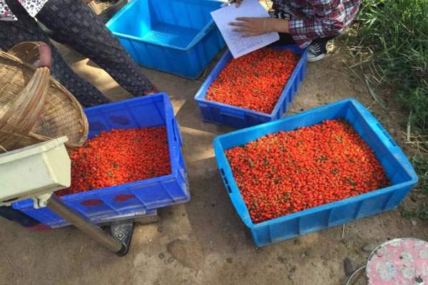 6月底进入采摘期所有枸杞都是人工一粒一粒手工采摘每人每天大概能采摘70~100斤鲜果!